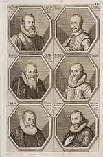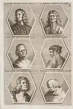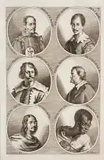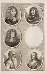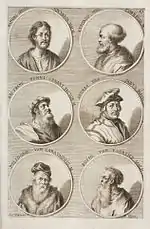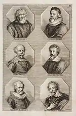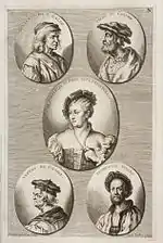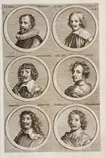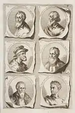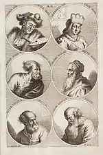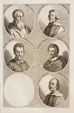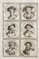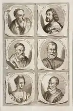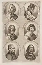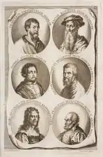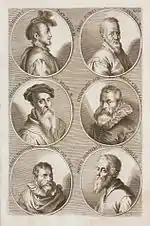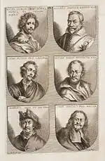 The German Academy of the Noble Arts of Architecture, Sculpture and Painting, or Teutsche Academie, refers to a comprehensive dictionary of art by Joachim von Sandrart published in the late 17th century. The first version was published in 1675 and it included a compilation of artist biographies that were later accompanied by illustrations by Richard Collin for a 1683 Latin edition by Christianus Rhodius. The list of portrait illustrations follows and is in page order. Most of the biographies were translated into German from earlier work by Karel van Mander and Cornelis de Bie, but Sandrart had travelled extensively in Europe and added many original biographies of German-born artists to his list. The illustrated portraits of artists born before his time were mostly based on 17th-century engravings by Hieronymus Cock and Jan Meyssens, many of which had also been re-published in De Bie's Het Gulden Cabinet.