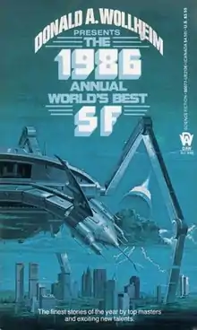 The 1986 Annual World's Best SF is an anthology of science fiction short stories edited by Donald A. Wollheim and Arthur W. Saha, the fourteenth volume in a series of nineteen. It was first published in paperback by DAW Books in June 1986, followed by a hardcover edition issued in August of the same year by the same publisher as a selection of the Science Fiction Book Club. For the hardcover edition the original cover art by Vincent Di Fate was replaced by a new cover painting by Ron Walotsky.