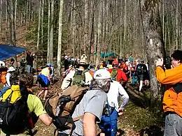The Barkley is limited to 35 runners and usually fills up quickly the day registration opens. Requirements and times to submit an entry application are a closely guarded secret with no details advertised publicly.[11] Potential entrants must complete an essay on "Why I Should be Allowed to Run in the Barkley," pay a $1.60 application fee, and complete other requirements subject to change. If accepted, an entrant receives a "letter of condolence." Upon arriving, first-time Barkley runners, known as virgins, are required to bring a license plate from their state/country as part of the entrance fee. Previous racers are required to bring an additional "fee" which in the past has included things such as a white shirt, socks, or a flannel shirt, as a donation for being a non-finisher. These donations are apparently based on the current needs of Lazarus Lake at the time. Prior finishers of the marathon who return to run again must submit a pack of Camel cigarettes as part of the registration fee. Race bib number one is always given to the person deemed to be the least likely to finish one lap out of all who have applied; a "human sacrifice," as Cantrell calls it.[12]