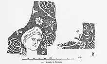 Some 24 centuries old, the mosaic known as The Beauty of Durrës has a surface area of about nine square metres. It is elliptical in shape, some 5.1 metres (17 ft) across at the widest and some 3 metres (9.8 ft) at the narrowest. The mosaic is made of unworked coloured pebbles and is still in fairly good condition.[6] The formal expression represents a good example of the art of antiquity, in which Hellenistic art is combined with the local motifs of Illyrian art. It is considered one of the world's most expressive mosaics of its genre.[7] From a stylistical point of view, the mosaic resembles mosaics of the same period discovered in Pella, once part of Ancient Macedonia.[2][6]