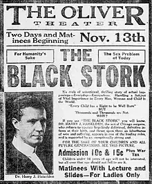 The Black Stork, also known as Are You Fit To Marry?, is a 1917 American motion picture film both written by and starring Harry J. Haiselden, who was the chief surgeon at the German-American Hospital in Chicago.[1] The Black Stork is Haiselden's fictionalized account of his eugenic infanticide of John Bollinger, who was born with severe disabilities.[2] The film depicts Haiselden's fictionalized story of a woman who has a nightmare of a severely disabled child being a menace to society. Once awoken from the nightmare, she visits a doctor and realizes all was fine with her child. However, the purpose of the film was not to have a happy ending and move on. The purpose was to basically warn people, especially teenagers, of the dangers of sexual promiscuity and "race mixing", as these actions were believed to be the cause of disabilities in children.[3]