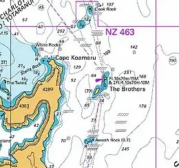 The Brothers (Māori: Ngāwhatu-kai-ponu) is a group of small islands in Cook Strait, New Zealand, off the east coast of Cape Koamaru, Arapaoa Island. The islands are a restricted-access wildlife sanctuary administered by the Department of Conservation.[1]