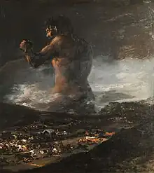 The Colossus (also known as The Giant), is known in Spanish as El Coloso and also El Gigante (The Giant), El Pánico (The Panic) and La Tormenta (The Storm).[2] It is a painting traditionally attributed to Francisco de Goya that shows a giant in the centre of the canvas walking towards the left hand side of the picture. Mountains obscure his legs up to his thighs and clouds surround his body; the giant appears to be adopting an aggressive posture as he is holding one of his fists up at shoulder height. A dark valley containing a crowd of people and herds of cattle fleeing in all directions occupies the lower third of the painting.