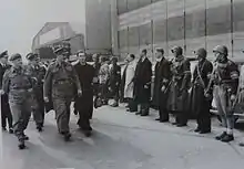 Ole Lippmann (on the right) receives the British Major-General R.H.Dewing,[12] from the Allied headquarters, in front of an honorary company of resistance fighters on 5 May 1945.