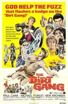 The Dirt Gang is a 1972 American action drama film directed by Jerry Jameson and starring Paul Carr, Michael Pataki, Lee de Broux, Jon Shank, Nancy Harris, T.J. Escott, and Jessica Stuart. The film was released by American International Pictures in November 1972.[1][2][3]