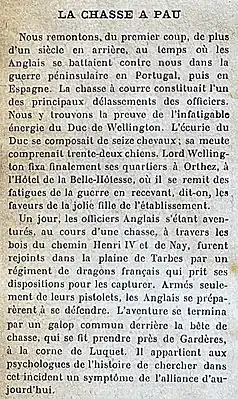 Firstly, we must go back a full century, when the English fought against us during the Peninsular War in Portugal. Fox-Hunting then was the chief diversion of the officers. The Duke of Wellington's stable consisted of 16 hunters; his pack was 32 hounds strong. The Duke's quarters were finally fixed at Orthez at the Belle Hôtesse inn, where he rested after the war and received, they say, the favors of the pretty girl of the establishment. One day, while the adventurous officers, in the course of a hunt, had crossed through Henry IV road and Nay, they were overtaken in the Tarbes plain by a detachment from a regiment of French dragoons, who, at once, took their positions to capture them. Armed solely with their pistols, the English prepared to defend themselves. The adventure ended with a collective gallop behind the fox who got himself caught near the village of Gardères, at the Luquet-Horn of the wood.[11][lower-alpha 8]