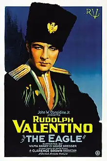 The Eagle is a 1925 American silent drama film directed by Clarence Brown and starring Rudolph Valentino, Vilma Bánky, and Louise Dresser.[1] Based on the posthumously published 1841 novel Dubrovsky by Alexander Pushkin,[2] the film is about a lieutenant in the Russian army who catches the eye of Czarina Catherine II. After he rejects her advances and flees, she puts out a warrant for his arrest, dead or alive. When he learns that his father has been persecuted and killed, he dons a black mask and becomes an outlaw. Black Eagle does not exist in the novel and was inspired by the performance of Douglas Fairbanks as Zorro in The Mark of Zorro.[3]