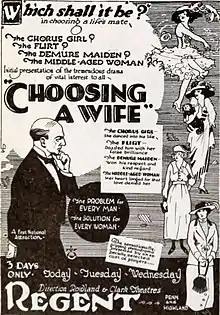 Advertisement for the British drama film The Elder Miss Blossom under its alternate American title Choosing a Wife, for the Regent Theater in Pittsburgh, Pennsylvania, August 1919