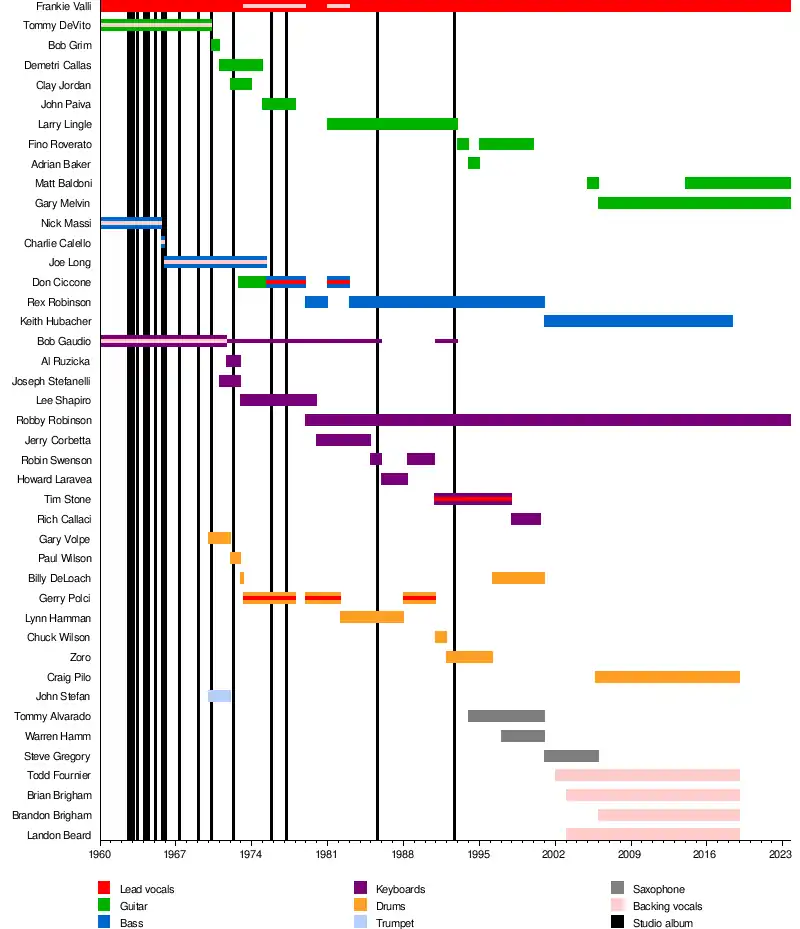 8. 1 2 Eggers, Kerry (June 20, 2018). "Frankie Valli: a man for all seasons". Pamplin Media Group. Retrieved December 1, 2021. Valli: Including four singers, we have 15 or 16 in our group. We have a couple of new members. I feel good about what we have now. It's something you put together very slowly to make sure you have the right people. My musical director, Robby Robinson (and longtime keyboardest and honorary "Fifth Season" for the group), has been with me about 40 years.
