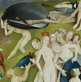 The impression of a life lived without consequence, or what art historian Hans Belting describes as "unspoilt and pre-moral existence", is underscored by the absence of children and old people.[38] According to the second and third chapters of Genesis, Adam and Eve's children were born after they were expelled from Eden. This has led some commentators, in particular Belting, to theorise that the panel represents the world if the two had not been driven out "among the thorns and thistles of the world". In Fraenger's view, the scene illustrates "a utopia, a garden of divine delight before the Fall, or—since Bosch could not deny the existence of the dogma of original sin—a millennial condition that would arise if, after expiation of Original Sin, humanity were permitted to return to Paradise and to a state of tranquil harmony embracing all Creation."[39]