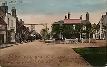 Also by this time, the former gallows had been converted into an inn sign that soon became a landmark,[19][31] and some structural and exterior alterations were made—the first of many over the subsequent years.[36] The earliest known photograph of the George, dated 1867, shows a dilapidated building of several uncoordinated parts: it had expanded over the years to take in buildings on each side of the original medieval inn, and it was considered a purely functional building with no obvious architectural merit.[37] By this time, the coaching era was in terminal decline because of the increasing popularity of rail travel; a line was opened between London and Brighton in 1841, with a station at Three Bridges just east of Crawley,[38] and the town centre received its own branch line and station in 1848.[39] Despite this, Crawley High Street remained busy as the town continued to grow, and The George underwent more renovation and was extended further. In particular, an old (possibly 18th-century) free-standing building which stood in the middle of the wide High Street, and which was once used as a candle factory, was acquired by the George's owners and became an annex.[40][41] It was this building, rather than the main part of the hotel, which accommodated Queen Victoria when she was forced to stay overnight.[34] Cycling for leisure purposes became a fad in the late 19th century, and the London–Brighton road was a popular route; the George became a regular stopping point for groups of cyclists.[42]