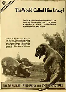 The Ghost of Slumber Mountain is a 1918 film written and directed by special effects pioneer Willis O'Brien, produced by Herbert M. Dawley, and starring both men. It is the first film to show live actors and stop-motion creatures together on the screen[2][3] and is often cited as a trial run for The Lost World. An advertising tagline for the film read "These giant monsters of the past are seen to breathe, to live again, to move and battle as they did at the dawn of life!". The film attracted the interest of Watterson R. Rothacker, founder of the Industrial Motion Picture Company, who was so impressed by the film's special effects, he joined forces with O'Brien to create the dinosaurs of The Lost World (1925), a classic that advanced the development of special effects techniques.[4]