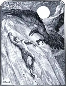 The eagle attacks the youth on the slopes of Glass Mountain. Illustration from The Yellow Fairy Book (1894).
