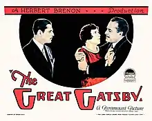 The Great Gatsby is a 1926 American silent drama film directed by Herbert Brenon.[1] It was the first film adaptation of the 1925 novel of the same name by F. Scott Fitzgerald. Warner Baxter portrayed Jay Gatsby and Lois Wilson portrayed Daisy Buchanan.[2] The film was produced by Famous Players–Lasky, and distributed by Paramount Pictures. The Great Gatsby is now considered lost.[3][4] A vintage movie trailer displaying short clips of the film still exists.