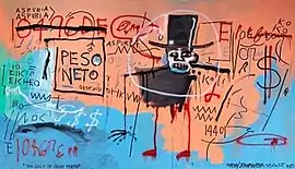 The painting—which measures almost 14 feet across—features Baron Samedi, chief of the Gede family of lwa in Haitian Vodou, responsible for accepting individuals into death and resurrection.[5] The keeper of death's iconography includes a black top hat and long black coat, and his face painted like a skull.[6] Basquiat, whose father was from Haiti, also portrayed Baron Samedi in his 1987 painting Después de un Puño.[7]