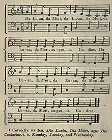 - ↑ In the 3rd edition of 1834, the text was corrupted and became "augus Da Cadine, augus Da Hena", and footnoted as "And Wednesday and Thursday",[12] erroneously, as pointed out by Keightley, for "Da Hena" is Friday.[9] While Yeats retained the original correct days,[13] the erroneous version was unfortunately repeated by Joseph Jacobs,[14] as pointed out by a Japanese researcher.[15]