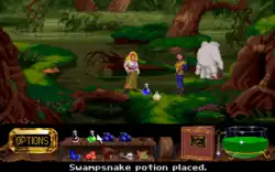 Players can create potions using a cauldron in the interface, once acquired, but only by using the right objects to make them, with each potion varying in the amount of doses they get to use; the cauldron can be emptied before all doses are used if another potion is required. Additional recipes can be acquired by finding missing spell pages during the game. Unlike its predecessor, the player cannot retain all the items they find when moving forward; only certain items are retained for later use. As with the first game, there are hazardous situations that, if not handled correctly, can lead to an automatic game over, forcing players to start anew or reload a previous save file.