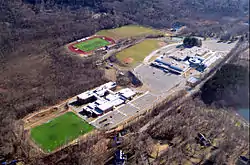 An aerial view of Scotts Ridge Middle School (closer) and Ridgefield High School (farther), which share the same campus.
