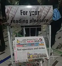 The New Age newspaper was a South African national daily newspaper, owned and operated by TNA Media (Pty) Ltd. It was established in June 2010 with its first publication on 6 December 2010. It was later re-branded as Afro Voice in April 2018. Its last edition was published on 29 June 2018.[1]
