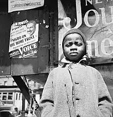 A Harlem newsboy stands in front of a poster for a series in The People's Voice (May 1943).