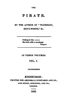 The Pirate was published in three volumes by Constable and Ballantyne in Edinburgh on 24 December 1821 and by Hurst, Robinson, and Co. in London two days later.[5] As with all the Waverley novels before 1827 publication was anonymous. The print run was 12,000, though 2000 of these were a late afterthought which resulted in a bibliographical complication. The price was one and a half guineas (£1 11s 6d or £1.57½). It is unlikely that Scott was involved with the novel again until March and then August 1830 when he revised the text and provided an introduction and notes for the 'Magnum' edition in which it appeared as Volumes 24 and 25 in May and June 1831.