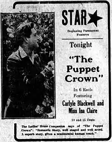 The Puppet Crown is a 1915 American drama silent film directed by George Melford and written by Harold MacGrath and William C. deMille. The film stars Ina Claire, Carlyle Blackwell, Chris Lynton, Cleo Ridgely, Horace B. Carpenter and John Abraham. The film was released on July 29, 1915, by Paramount Pictures.[1][2]