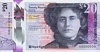 The Royal Bank of Scotland £20 note is a sterling banknote. It is the third largest denomination of banknote issued by The Royal Bank of Scotland. The current polymer note, first issued in 2020, bears the image of Catherine Cranston on the obverse and a vignette depicting a pair of Red Squirrels on the reverse.