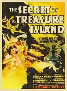Columbia announced plans to distribute the serial in a June 29, 1937 press release describing the studio's 1937-38 program.[3] It was the third serial released by Columbia, and the first of five costume chapter plays.[1] According to Columbia publicists, the story was updated from Robert Louis Stevenson's famous Treasure Island, adapted to fit the time period; L. Ron Hubbard asserted instead that he had adapted the screenplay from his original story Murder at Pirate Castle.[4] An advertisement in the Motion Picture Herald described Hubbard as a "famous action writer, stunt pilot and world adventurer", and stated that he had written an "excitement-jammed yarn with one of the best boxoffice titles in years".[5] After his work on The Secret of Treasure Island, L. Ron Hubbard also helped with the script for the 1941 Columbia movie serial, The Spider Returns.[6]