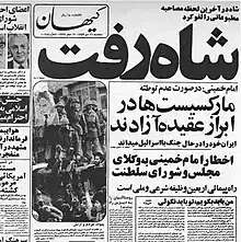 "The Shah Is Gone" (Persian: شاه رفت, romanized: Šâh raft) is a headline that appeared on the front cover of the Iranian newspaper Ettela'at on Tuesday, 16 January 1979, when the Shah left Iran, a few days before the fall of the Pahlavi dynasty and the 2500-year-old Iranian monarchy. The title contains the word shah (king) instead of shahanshah (king of kings) to refer to Mohammad Reza Pahlavi, which was very rare during his reign. It is described as the "most famous headline in the history of Iran".[1][2][3][4]