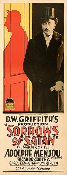 The Sorrows of Satan is a 1926 American silent drama film directed by D. W. Griffith, and based on the 1895 allegorical horror novel The Sorrows of Satan by Marie Corelli.[2]
