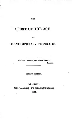 The Spirit of the Age (full title The Spirit of the Age: Or, Contemporary Portraits) is a collection of character sketches by the early 19th century English essayist, literary critic, and social commentator William Hazlitt, portraying 25 men, mostly British, whom he believed to represent significant trends in the thought, literature, and politics of his time. The subjects include thinkers, social reformers, politicians, poets, essayists, and novelists, many of whom Hazlitt was personally acquainted with or had encountered. Originally appearing in English periodicals, mostly The New Monthly Magazine in 1824, the essays were collected with several others written for the purpose and published in book form in 1825.