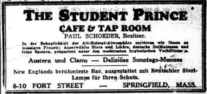 On September 24, 1935, Paul Schoeder, a German immigrant from Spremberg active in Springfield's turnverein,[9] opened the Student Prince Cafe & Tap Room at 8 Fort Street in the storefront of a former shoe store.[10] At the time of the restaurant's opening, the namesake operetta, The Student Prince, was remarkably popular in Springfield, with annual performances at the Court Square Theater during ten years prior to the establishment's opening,[11] and leading man Howard Marsh making his radio debut as Prince Karl on WTIC in neighboring Hartford.[12] Schoeder would place a two-column ad in the Springfield Republican on opening day which billed the restaurant as "A bit of the charm of the Old World with the modernity of the New...serving German food and delicatessen".[13] With the Springfield newspapers' offices in the same block, the restaurant quickly became a regular meeting place for reporters and politicians such as Edward Boland and Larry O'Brien.[10]