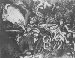 Members of The Ten exhibited several dozen works at its shows, commonly in equal proportion at a given show.[lower-alpha 5] Although some members disliked the descriptor "social realism", earlier works nevertheless dealt with social themes and working class life, subject matter unavoidable during the Depression. To illustrate, the art historian Isabelle Dervaux detailed three pictures from the first Montross exhibition. Lynching by Ben-Zion used expressionistic distortion to convey the horror and confusion of a lynching. Despite his personal ambivalence to social themes and preference for abstraction, Bolotowsky contributed a figurative cubist work—Sweatshop—depicting a seamstress; his mother-in-law was the model. A more placid scene was Adolph Gottlieb's Conference which depicted a meeting of five women, showing the influence of Milton Avery on the group.[26] As the 1930s progressed the group moved away from explicitly social themes and toward urban scenery and abstraction; Dervaux noted several titles describing nocturnes and cityscapes at the Whitney Dissenters exhibit. She also identified Rothko's Interior as an early work which featured coloristic division of space into rectangular forms, anticipating his later color field paintings, an observation repeated by the art historian David Anfam.[27]