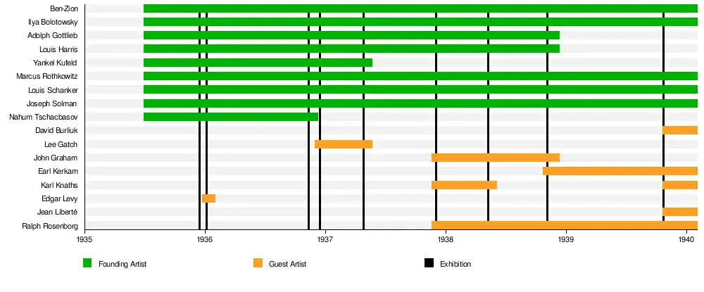 The group's nine shows were held at galleries and locations around New York City, including one international exhibition in Paris. The count of nine shows includes a brief art auction held from December 3–5, 1937, for the benefit of children affected by the Spanish Civil War.[lower-alpha 4]