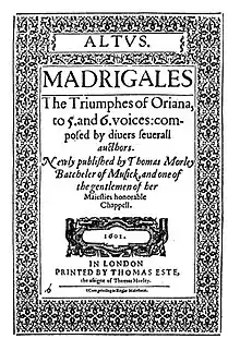 The Triumphs of Oriana is a book of English madrigals, compiled and published in 1601 by Thomas Morley, which first edition[1] has 25 pieces by 23 composers (Thomas Morley and Ellis Gibbons have two madrigals) for 5 and 6 voices. The first 14 madrigals are for 5vv, the last 11 for 6vv. It was said to have been made to honour Queen Elizabeth I. Every madrigal in the collection contains the following couplet at the end: “Then sang the shepherds and nymphs of Diana: long live fair Oriana” (the word "Oriana" often being used to refer to Queen Elizabeth) though some of the composers wrote variants of this refrain.