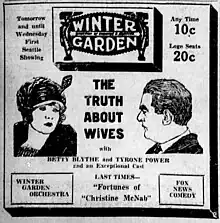 The Truth About Wives is a 1923 American silent drama film directed by Lawrence C. Windom and starring Betty Blythe, Tyrone Power Sr. and William P. Carleton.[1]