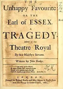 The first Drury Lane cast included Thomas Clark as The Earl of Essex, Philip Griffin as Earl of Southampton, Michael Mohun as Burleigh, Thomas Disney as Sir Walter Raleigh, Anne Marshall as Queen Elizabeth, Sarah Cooke as Countess of Rutland and Mary Corbett as Countess of Nottingham.[1] John Dryden wrote a special prologue for a performance attended by Charles II and his wife Catherine of Braganza.