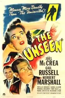 The Unseen is a 1945 American film noir mystery film directed by Lewis Allen and starring Joel McCrea. It's based on the 1942 novel Midnight House (US title: Her Heart in Her Throat) by Ethel Lina White.