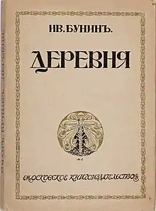 The Village (Russian: Деревня, romanized: Derévnya) is a short novel by the Nobel Prize-winning Russian author Ivan Bunin, written in 1909 and first published in 1910 by the Saint Petersburg magazine Sovremenny Mir under the title Novelet (Повесть). The Village caused much controversy at the time, though it was highly praised by Maxim Gorky (who from then on regarded the author as the major figure in Russian literature), among others, and is now generally regarded as Bunin's first masterpiece.[1][2] Composed of brief episodes set in its author's birthplace at the time of the 1905 Revolution, it tells the story of two peasant brothers, one a brute drunk, the other a gentler, more sympathetic character. Bunin's realistic portrayal of the country life jarred with the idealized picture of "unspoiled" peasants which was common for the mainstream Russian literature, and featured the characters deemed 'offensive' by many, which were "so far below the average in terms of intelligence as to be scarcely human."[3]