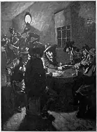 The Virginian is a ranch hand at the Sunk Creek Ranch, located outside of Medicine Bow, Wyoming. His friend Steve calls him "Jeff" presumably after Jefferson Davis, but he is always referred to as the Virginian, and no name is mentioned throughout the story. He is described as a tall, dark, slim young giant, with a deep personality. At first, he is only a cowboy, but halfway through the book, he is signed on as the full-time foreman. He is the Judge's most trusted worker. Several times throughout the book, he is offered the chance to run down his enemy, Trampas, behind his back, but each time he refuses the temptation, until Trampas challenges the Virginian to a duel. It is made clear that he will not use his official position as foreman to crush any of his employees. One of the main plots is the Virginian's ongoing romance with the newly appointed "schoolmarm" of Bear Creek School, Miss Molly Stark Wood. Being from the East, she is not used to the wild West, and the Virginian is a perfect gentleman to her, intending to make her "love him before we get through."[1]