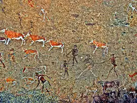 The painting has long been an archaeological dilemma, and several different hypotheses have been put forth on its origins, authorship and dating. It is now usually accepted to be a bushmen painting,[1] dating back to at least 2000 years.[2]