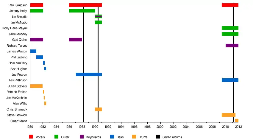 A year and a half later, the band had indeed reformed, albeit with a very revised line-up: founder and original member Paul Simpson was now joined by original member Ged Quinn, Ricky Rene Maymi (Brian Jonestown Massacre), Les Pattinson (Echo and the Bunnymen), Mike Mooney (Julian Cope/Spiritualized), and Steve Beswick (The Heart Throbs/Slipstream).[1] Quinn very quickly dropped out of performing with the group, but was still regarded as an 'honorary' member who made contributions to the group's promotional artwork.