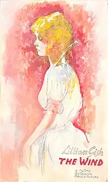 The Wind is a 1928 American synchronized sound romantic drama film directed by Victor Sjöström. While the film has no audible dialog, it was released with a synchronized musical score with sound effects using both the sound-on-disc and sound-on-film process. The movie was adapted by Frances Marion from the 1925 novel of the same name written by Dorothy Scarborough. Featuring Lillian Gish, Lars Hanson and Montagu Love, it is one of the last films released by Metro-Goldwyn-Mayer without audible dialogue and is considered to be among the greatest "silent" films.[1][2]