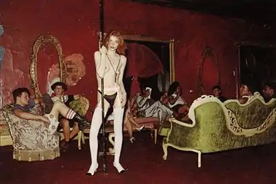 An early incubator of New York's house music and club kid scenes, the World helped launch the careers of several prominent nightlife figures, including Michael Alig, DJ Larry Tee, DJ David Morales, DJ Frankie Knuckles, DJ Kip Lavinger, DJ Zoe B, the Lady Bunny, and Dean Johnson, whose Tuesday night "Rock and Roll Fag Bar" party gave rise to New York's gay rock and roll scene.[3][4] Several big-name music acts also made cameo appearances at The World, including David Bowie, the Beastie Boys, The Ramones, Echo & the Bunnymen, Madness, Big Audio Dynamite, Sinéad O'Connor, Public Enemy, Neil Young, The Sugarcubes, Salt-N-Pepa, and Pink Floyd.[5] The World was also used as one of the filming locations for Devo's 1988 music video for the song "Disco Dancer"