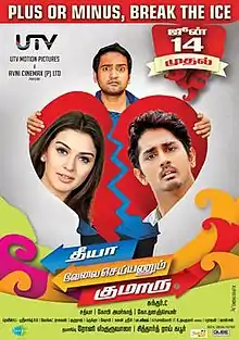 Theeya Velai Seiyyanum Kumaru (transl.You have got to work like fire, Kumar) is a 2013 Indian Tamil-language comedy film co-produced and directed by Sundar C. and produced by Khushbu. The film stars Siddharth, Hansika Motwani, and Santhanam.[3] The film was partially reshot in Telugu as Something Something with Brahmanandam replacing Santhanam and a different supporting cast.[4][5] The film released on 14 June 2013 to positive reviews, performing well at the box office and becoming a commercial success. [6][7]