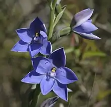 Thelymitra juncifolia, known as the large-spotted sun orchid,[2] is a species of orchid that is endemic to south-eastern Australia and to New Zealand. It has a single thin, dark green leaf and up to five blue flowers with relatively large, dark blue spots on the dorsal sepal and petals. It is similar to T. ixioides but has fewer, smaller flowers with larger dark blue spots.