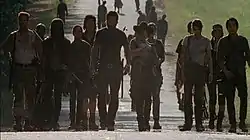 Later, Rick muses that this life may be easier for children, since growing up is getting used to the world. Michonne insists that this is not the world, and accepting it is giving up. Rick relates a story of his grandfather, who fought in World War II and survived by convincing himself that he was already a dead man. Rick says that like his grandfather, they have to "do what we need to do" in this reality until the situation changes and they are able to live, and tell themselves they "are the walking dead." Daryl rejects this notion, insisting that they aren't "them". A herd of walkers approaches the barn; Daryl, Maggie, and Sasha, who are not sleeping, work together to barricade the door, and are joined by the rest of the group.