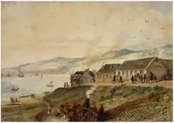 ![]() A painting of the Thistle Inn and the Courthouse on lower Mulgrave Street, close to the water's edge. There is a horseman, with lawyers and other people outside the courthouse. A European home with two chimneys is below the road on the left (ca 1843) | |