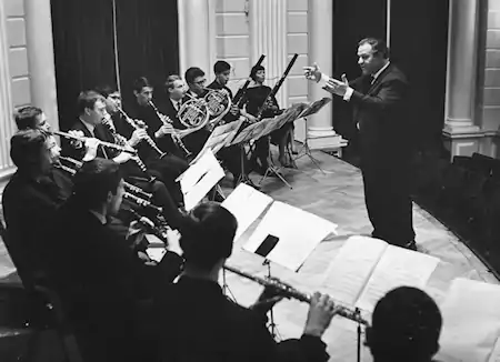 Besides being a bassoon player, bassoon maker and reed maker Thom de Klerk also was a music teacher at the Conservatorium van Amsterdam, the Sweelinck Academy. He was a teacher of, of course, the bassoon and also of the ensemble class. In this last capacity he was able to select the best students, among others Joep Terweij (bassoon), Martine Bakker (flute), George Pieterson (clarinet), Jaap Verhaar (French horn) and Edo de Waart (oboe). With these students he founded the Aulos Wind Ensemble, a group he expounded in 1959 and renamed the Netherlands Wind Ensemble.