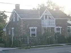 The 1+12-story house, with a rock basement (a former wine cellar), is made of 1.5-foot (46 cm) uncoursed rubble with cut-stone quoins on each corner. Each floor has four rooms; the hall-and-parlor plan on the front is hidden by a symmetrical, minimally-decorated facade, with an attic door set in a gable to allow large items to be brought up. Two large stone fireplaces remain in the front rooms. The building is extended by an original one-story lean-to on the rear, which served as the kitchen and hosts the staircase to the upper floor.[2][3]